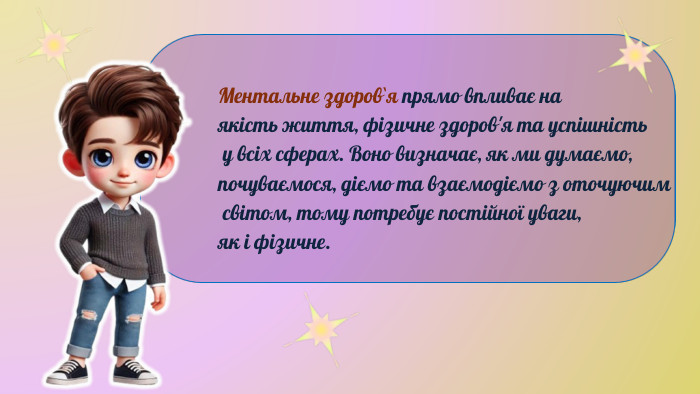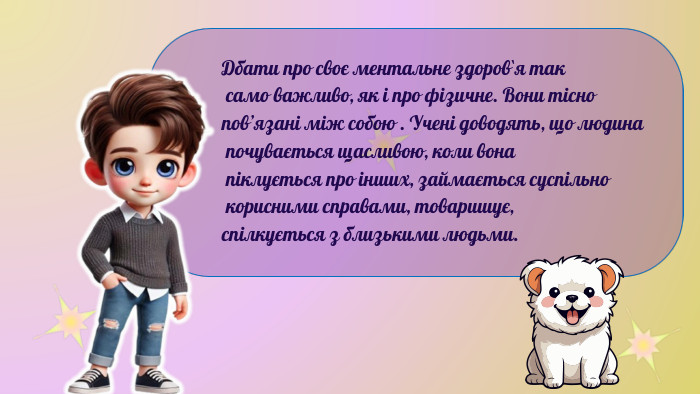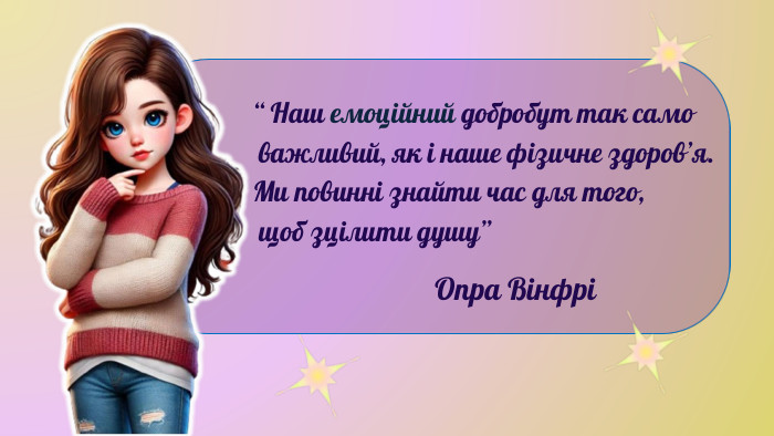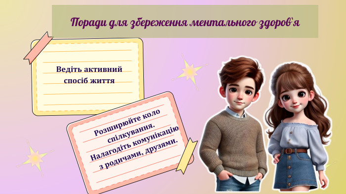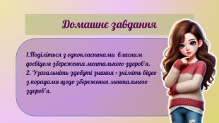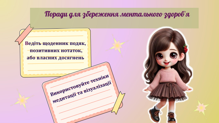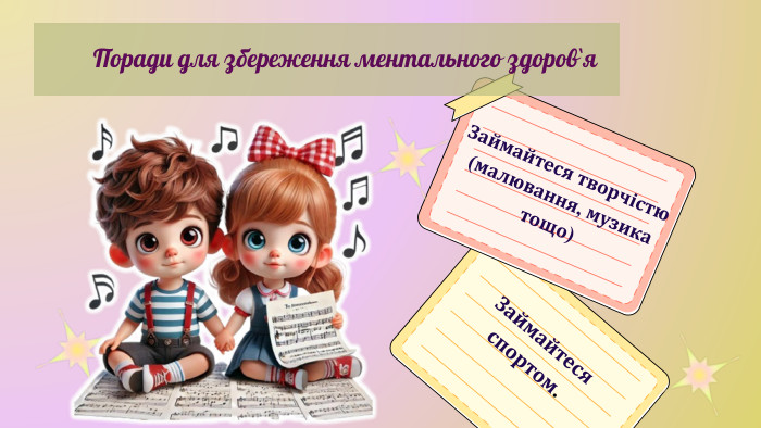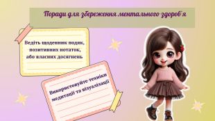 - Фізична активність:Регулярні заняття спортом або активності на свіжому повітрі позитивно впливають на емоційний стан і фізичне здоров'я.