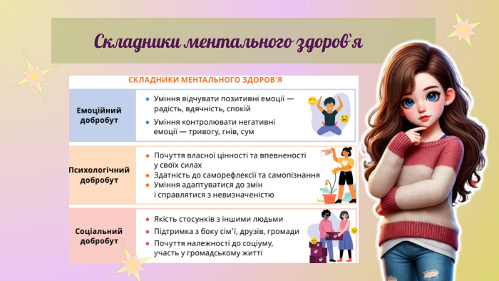 - Планування та цілі:Наявність цілей і вміння їх досягати позитивно впливає на загальний стан.