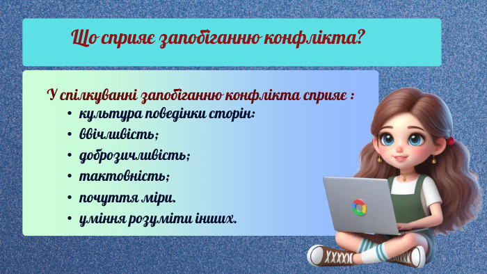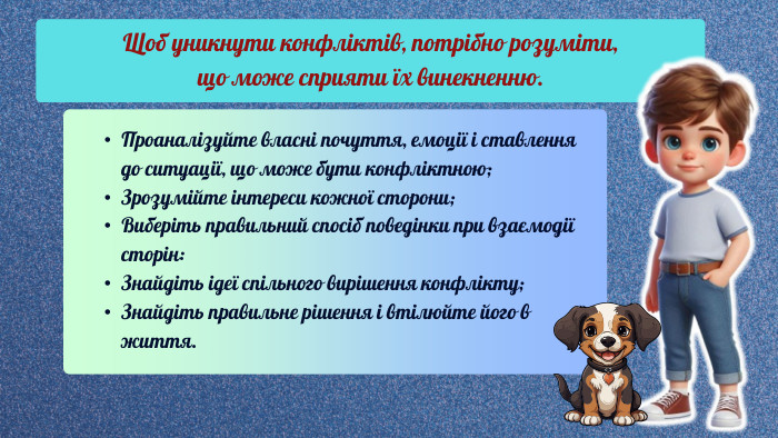 Щоб уникнути конфліктів, потрібно розуміти, що може сприяти їх винекненню. Проаналізуйте власні почуття, емоції і ставлення до ситуації, що може бути конфліктною;Зрозумійте інтереси кожної сторони;Виберіть правильний спосіб поведінки при взаємодії сторін: Знайдіть ідеї спільного вирішення конфлікту;Знайдіть правильне рішення і втілюйте його в життя.
