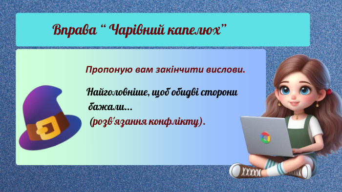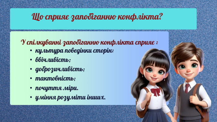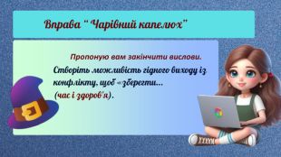 - Як кожний / кожна з учасників / учасниць ситуації могли б запобігти ескалації конфлікту?