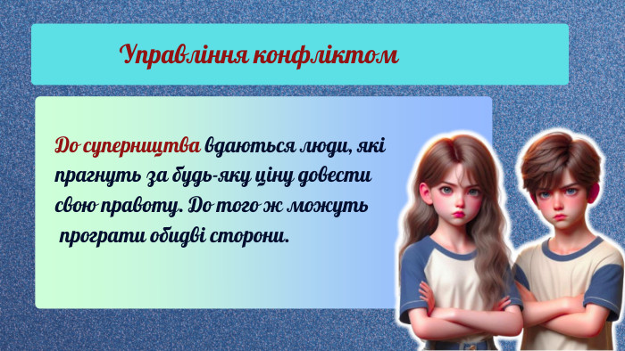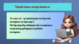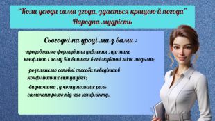 “Коли усюди сама згода, здається кращою й погода”Народна мудрість. Сьогодні на уроці ми з вами : -продовжимо формувати уявлення , що таке конфлікт і чому він виникає в спілкуванні між людьми;-розглянемо основні способи поведінки в конфліктних ситуаціях;-визначимо , у чому полягає роль самоконтролю під час конфлікту.