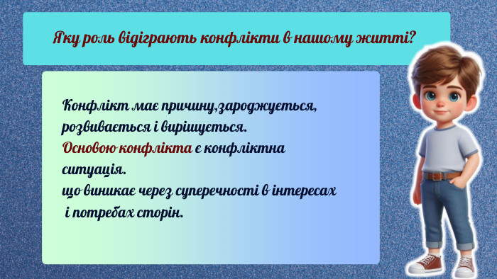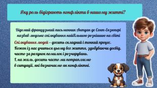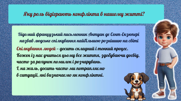 Яку роль відіграють конфлікти в нашому житті?Відомий французький письменник Антуан де Сент-Екзюпері назвав людське спілкування найбільшою розкішшю на світіСпілкування людей — досить складний і тонкий процес. Кожен із нас учиться цьому все життя, здобуваючи досвід, часто за рахунок помилок і розчарувань. І, на жаль, досить часто ми потрапляємо в ситуації, які визначаємо як конфліктні.