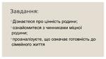 Самостійна робота (В-І)I рівень1. Що таке життєві цінності?2. Що таке якість життя?3. Коли починають формуватися життєві цінності?II рівень4. Яким чином формуються життєві цінності?5. Які основні життєві цінності сформували ваш характер?6. Як людина визначає якість свого життя?III рівень7. Чи можуть нам нав’язати чужі цінності, які ми не хочемо розділяти? 8. Чому люди інколи захищають свої переконання ціною власного життя?9. Поясніть, чому люди обирають різні критерії для оцінювання якості свого життя?IV рівень10. Доведіть, що життєві цінності є фундаментом особистості людини.11. Доведіть на прикладах, що характер людини формується під безпосереднім впливом життєвих цінностей.12. Чому саме вчинки визначають дійсні життєві цінності людини?